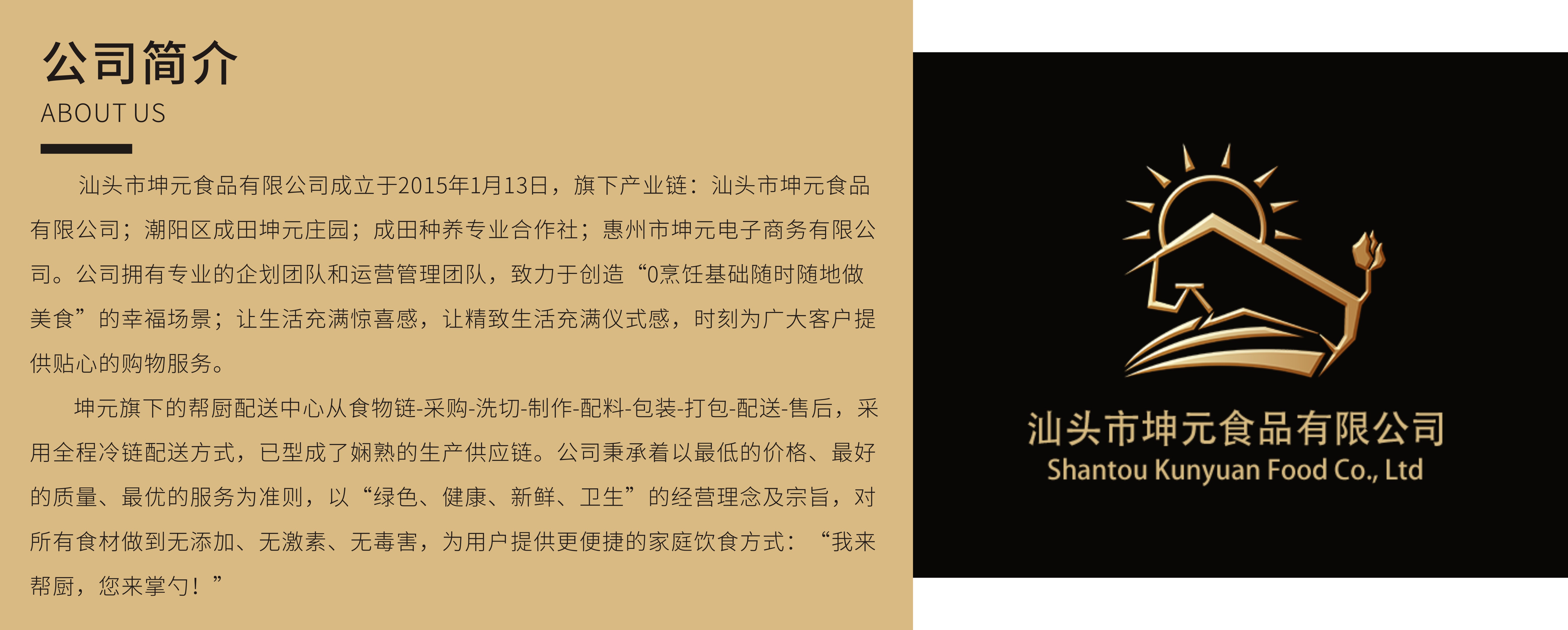 坤元幫廚配送中心致力于創(chuàng)造“0烹飪基礎隨時隨地做美食”的幸福場景;讓生活充滿驚喜感,讓精致生活充滿儀式感,時刻為廣大客戶提供貼心的購物服務。從食物鏈-采購-洗切-制作-配料-包裝-打包-配送-售后,采用全程冷鏈配送方式,已型成了嫻熟的生產(chǎn)供應鏈。公司秉承著以最低的價格、最好的質(zhì)量、最優(yōu)的服務為準則,以“綠色、健康、新鮮、衛(wèi)生”的經(jīng)營理念及宗旨,對所有食材做到無添加、無激素、無毒害,為用戶提供更便捷的家庭飲食方式:“我來幫廚,您來掌勺!”